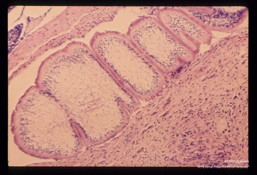 Description: Experimental sparganum infection in a rat. A high power longitudinal section through a portion of a single worm reveals structural detail.