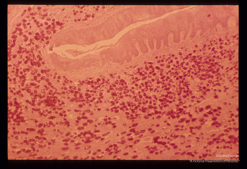 Description: Eggs in human urinary bladder. The open space at the upper portion of the slide is the bladder lumen. The normal urinary bladder epithelium has been replaced by squamous cells.