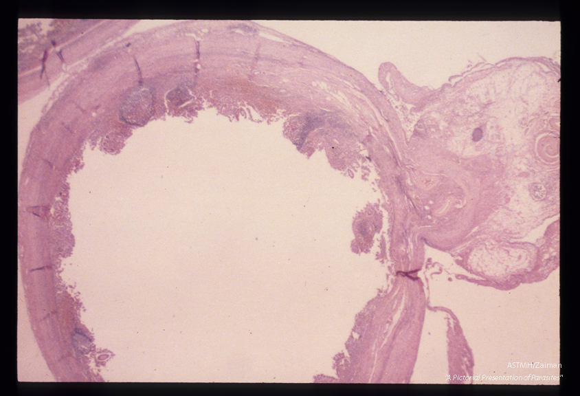 Description: Adult male in the mesoappendiceal vein. The parasite is seen as a coiled object in the upper right hand corner. No ova were seen in the appendix itself.