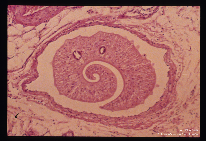 Description: Adult male in mesoappendiceal vein. At this magnification the digestive ceca and cuticular tubercles are easily seen.
