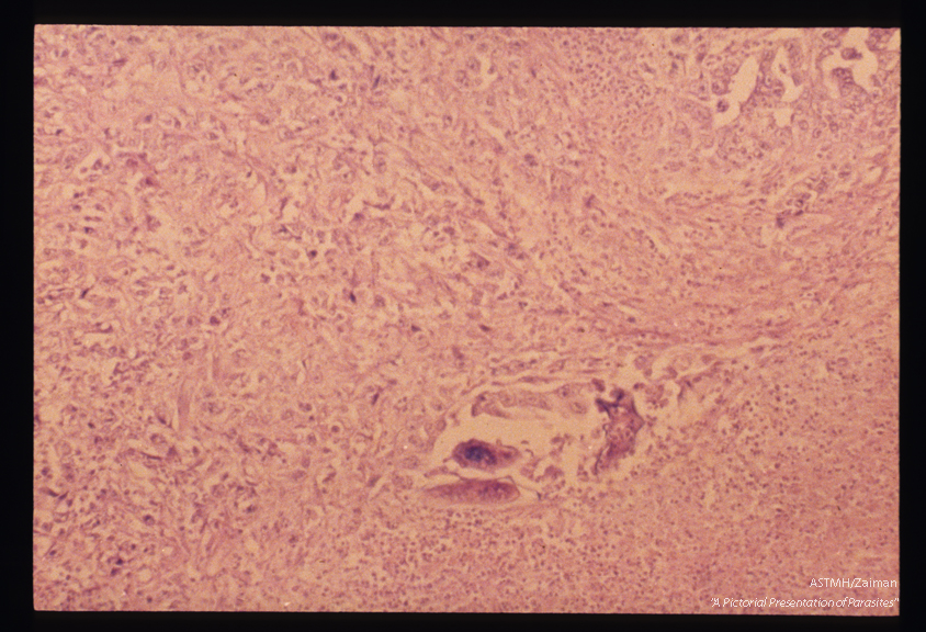 Description: Eggs in an adenocarcinoma of the rectal mucosa. The ova are more deeply stained than the surrounding tumor.