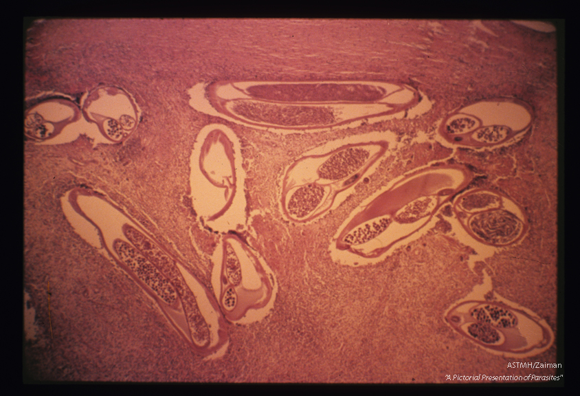 Description: In a subcutaneous nodule. The fibrotic nodule contains coiled up worms which are sectioned in various planes. Note the cuticle, the uterus containing microfilariae in various stages of development and the digestive tract which has a lesser diameter than the uteri.
