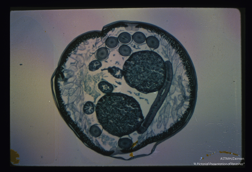Description: Cross section of an adult female. The outer cuticle is partially detached from the parasite at 12 o'clock. Below it, one can see the hypodermis and musculature. Lateral lines are visible at 12 and 6 o'clock. Central to the musculature, the flattened tube is gut, the round tubes are reproductive structures. The large round tubes are egg-containing uteri, the others are sections through ovaries and oviducts.