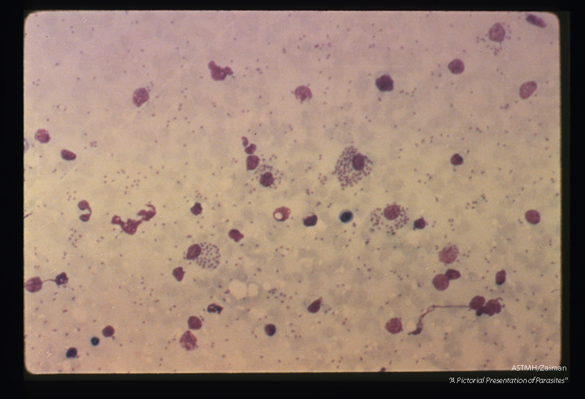 Description: Low power view of touch preparation made from experimentally infected hamster spleen. Several macrophages contain numerous parasites. Other parasites appear free in the fluid portion of the preparation.