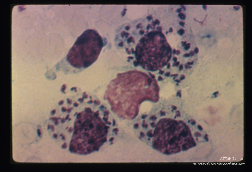 Description: High power view of touch preparation made from experimentally infected hamster. Several parasites are present in each of three macrophages.