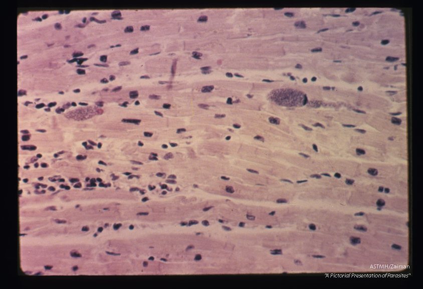 Description: Pseudocysts in human heart. This low power view shows two pseudocysts in the myocardium of an adult patient who had a concommitant blood dyscrasia. Numerous organisms are present in each of the cysts. One of the pseudocysts has a tail-like extension.