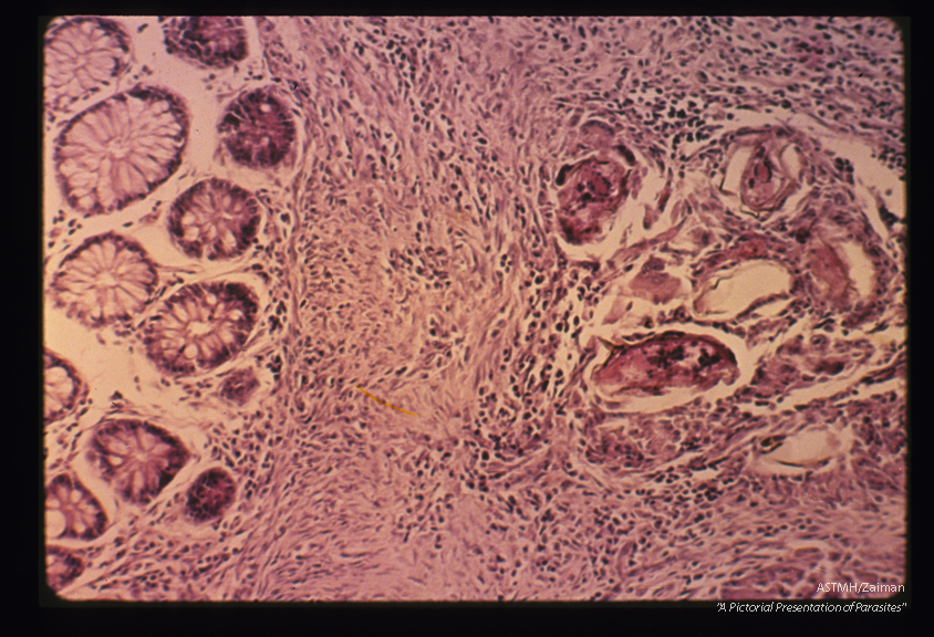 Eggs in H & E preparation of bowel. One of the eggs in this granuloma shows a lateral spine nicely.