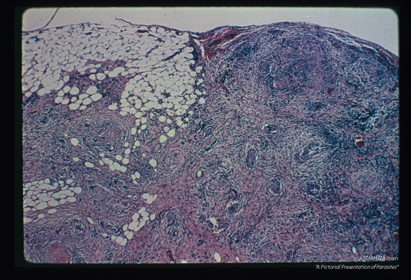 Description: Granulomatous reaction around eggs in mesenteries. A middle aged Puerto Rican female suffering from signs and symptoms of cholecystitis was explored surgically. Gross inspection of the abdomen revealed a thickened mesentery studded with yellow-white granules suggesting metastatic carcinoma. Cholecystectomy was performed. The mesenteric nodules were due to eggs of Schistosoma mansoni.