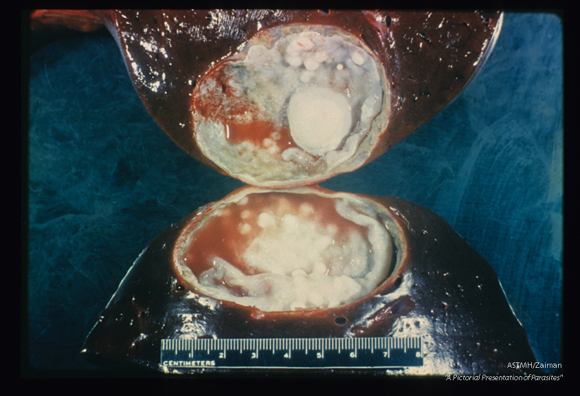 Description: Cyst in liver. A young male died of unknown cause on his honeymoon. At autopsy his liver showed an intact well encapsulated hydatid cyst. The spherical cyst has been hemi-sected. The halves are seen side by side. The cyst wall is retracted from the liver at some points. Daughter cysts and brood capsules may be seen. The red material within the cyst is blood which accumulated there following dissection.