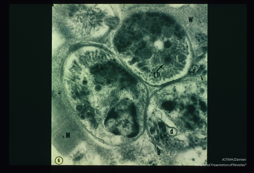 Description: Ultrastructure of parasite in human heart muscle. The nucleus and pellicle are well demonstrated in this photograph. d-dumb-bell shaped bodies seen in and outside parasites, m-cardiac myofibre, tp-Convoluted tube with increased density in central core