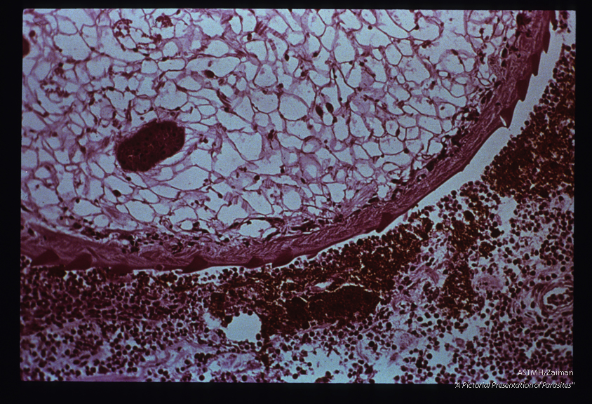 Description: Adult embedded in intestinal wall. The parasite presents as an oval to round mass limited by a spined cuticle. The parasitic parenchyme is punctuated by multiple sections through gut (reddish-brown). The two centrally located tubular structures, separated by a light staining muscular sucker, are part of the reproductive apparatus of the parasite. A marked inflammatory response is present in the adjacent host tissues and fresh red blood cells can be seen near the parasite.
