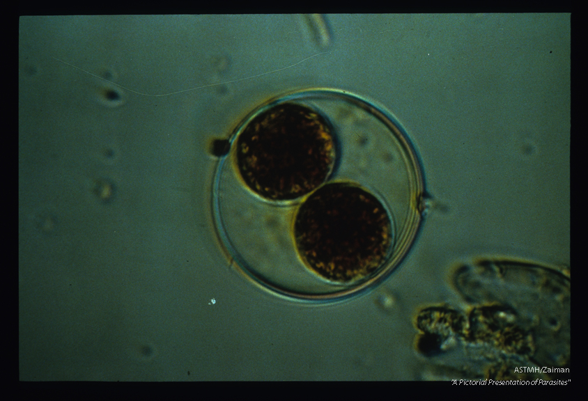 Description: The oocyst has been penetrated by iodine and the two sporocysts stained.