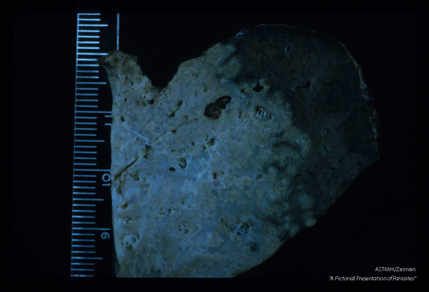 Description: Eskimo liver, formalin fixed. In the lighter regions, the liver parenchyme has been replaced by the parasite.