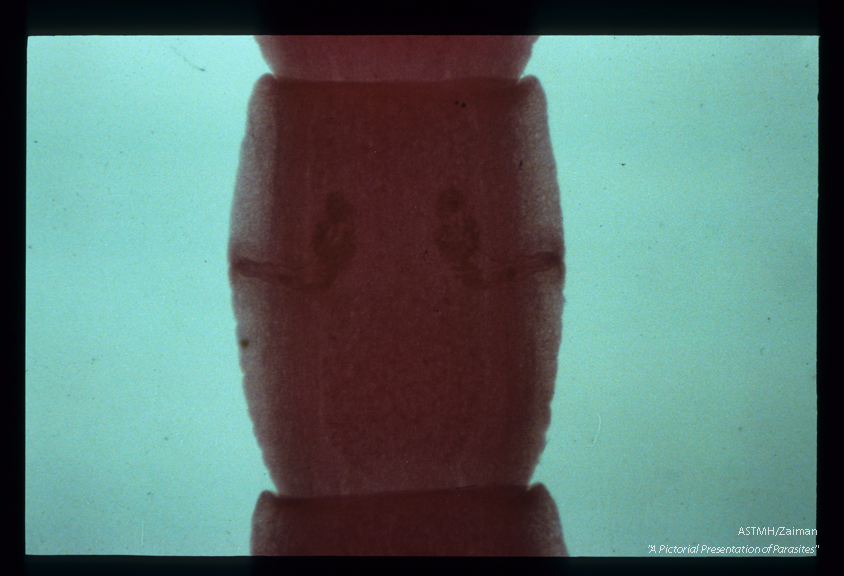 Description: Maturing proglottid shows double set of sexual organs, with a lateral genital pore on each side.