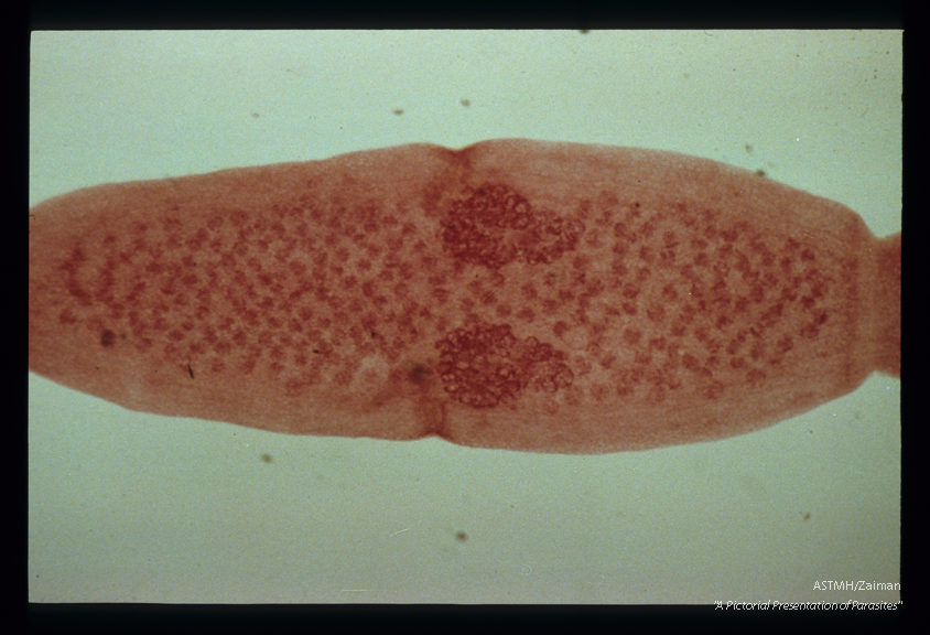 Description: Gravid proglottid again showing the double set of genital organs. The masses within the proglottids are groups of eggs.