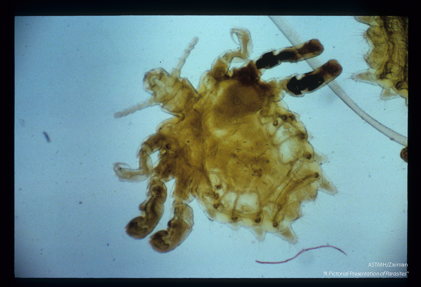 Description: Crab lice have a relatively narrow head, a broad thorax and crab-like claws. Respiratory spiracles and trachea are clearly shown.