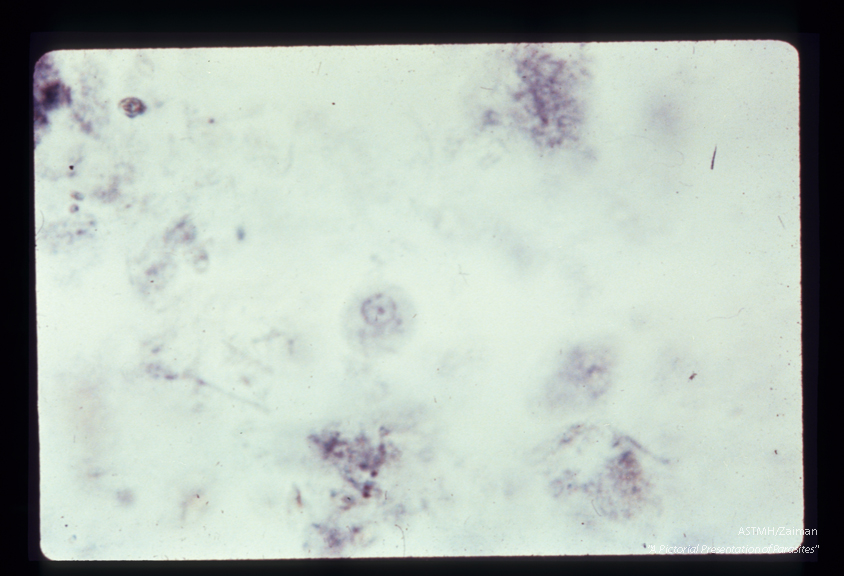 Description: Small race trophozoite, iron hematoxylin stain. The karyosome is small and centrally located; the nuclear chromatin consists of small, fairly regular beads.