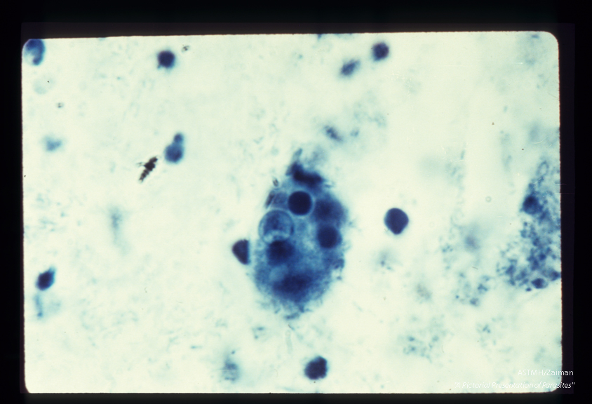 Description: Trophozoites . iron hematoxylin stain. Each specimen has engulfed red blood cells which stain darkly.