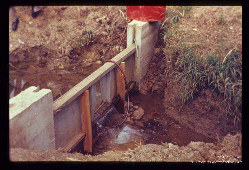Description: Weir placed across small stream and fitted with apparatus which instills molluscicide according to rate of water flow (Puerto Rico).