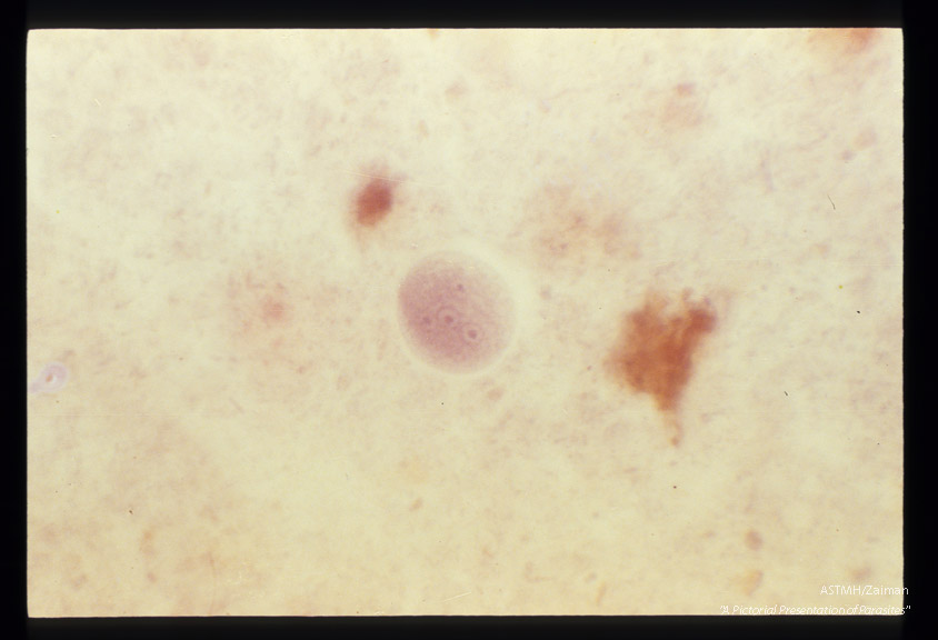 Description: Cysts in stool, showing various numbers of nuclei, hematoxylin stain.