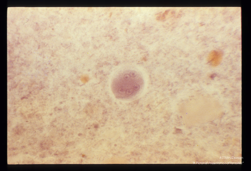 Description: Cysts in stool, showing various numbers of nuclei, hematoxylin stain.