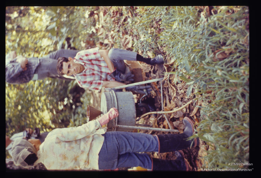 Description: Straining cercariae from polluted waters. Old model apparatus.