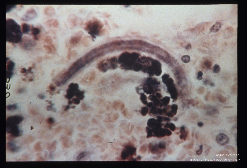 Hematoxylin-eosin stained section of human lung showing larva in alveolus.