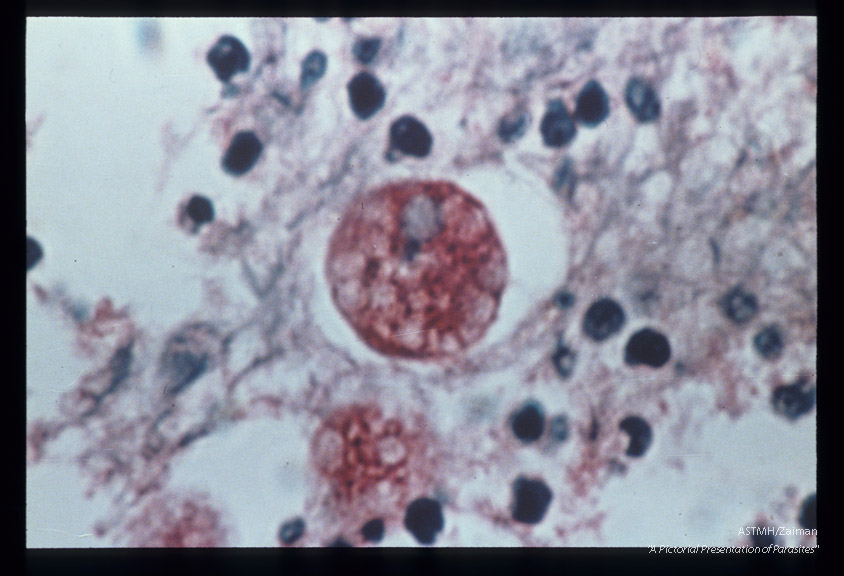 Description: Best carmine stained section of rectum. Note trophozoite with ingested red blood cell.