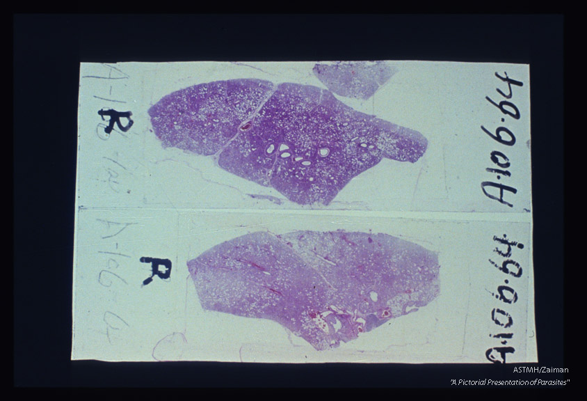 Description: Sections through lungs of experimentally infected rats showing infiltration in hilar, peribronchial and subpleural areas where such infections usually start. The infection is not evenly distributed through the lung sections.