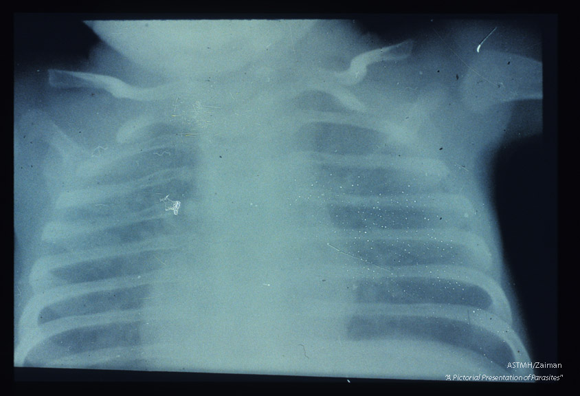 X-ray of child with pneumonia showing the characteristic ground glass appearance of such lungs.