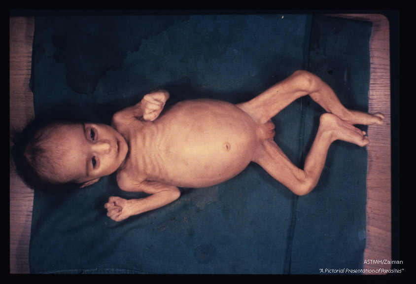 Description: Premature infant who died of pneumonia four months after birth. Note the total marasmus, the rachitic rosary, protruding abdomen and severe muscle wasting.