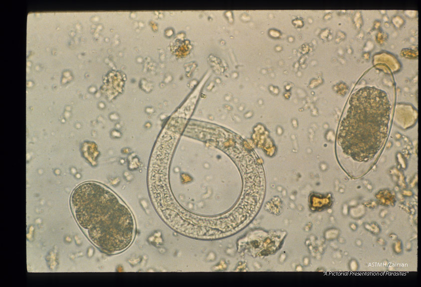 Description: Trichostrongylus egg, and Strongyloides stercoralis larva. All from one patient.