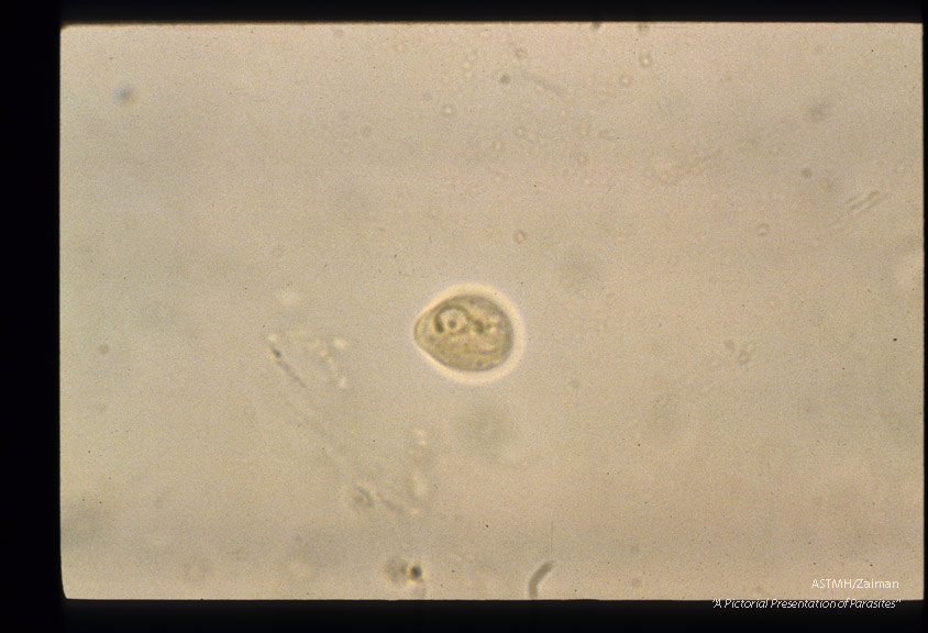 Description: Uninucleate lemon shaped cyst, iodine stained.