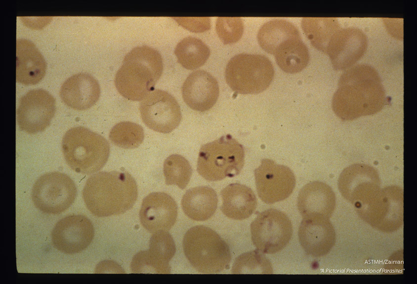 Description: Severe infection with red blood cell harboring several parasites.