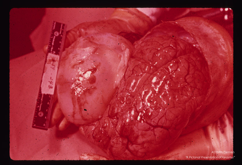 Description: Cyst in brain. Photograph of seven year old Italian-born female who fell down five steps and shortly thereafter became unconscious for a few seconds. Vomited for a week. One month later she developed convulsions, headaches, and intermittent drowsiness. A few hours prior to hospitalization, she vomited (nonprojectile), convulsed, complained of pain in the neck and became drowsy. Physical examination showed neck stiffness, hyperactive knee jerks, positive Kernig and Babinski reflexes. The patient went into a deep coma with occasional involuntary motions and died two days after admission. At autopsy, a 250 gram, 10 x 5 cm,, white-walled cyst bulged through the gray matter of the left cerebrum. Subsequent microscopic examination of the cyst wall revealed typical scolices of Echinococcus granulosus.