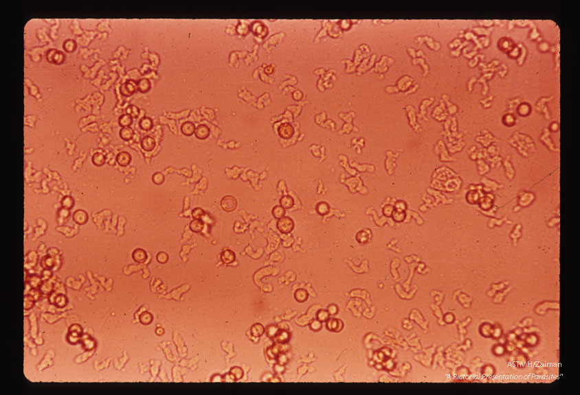 Description: Lee-culture showing rbc, few cysts and amoeboid cells.