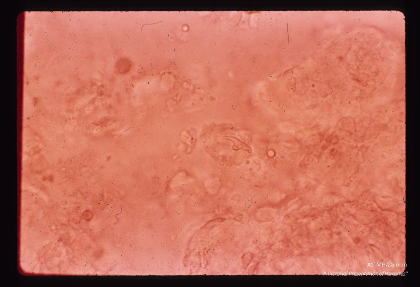 Description: Free hooklets in renal cyst sand.