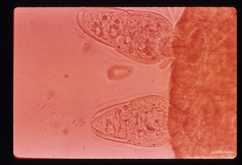 Description: Two miracidia penetrating the snail host. Second row of epidermal plates being shed by one of the miracidia.