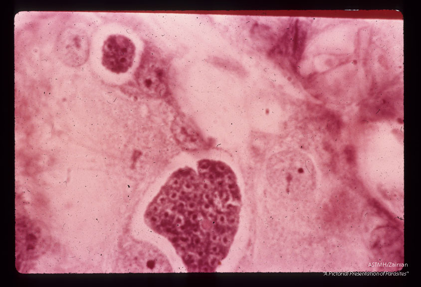Description: Small and large multinucleate schizonts. Note the refractile globules which persist in first-generation development. H & E stain. (36 hr).