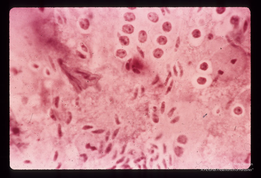 Description: First-generation merozoites and second-generation trophozoites. Note the absence of refractile globules. H & E stain. (72 hr).