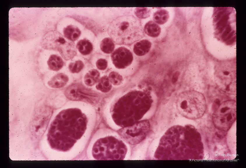 Description: Immature second-generation schizonts. Note multiple infections of single cells. H & E stain. (96 hr).