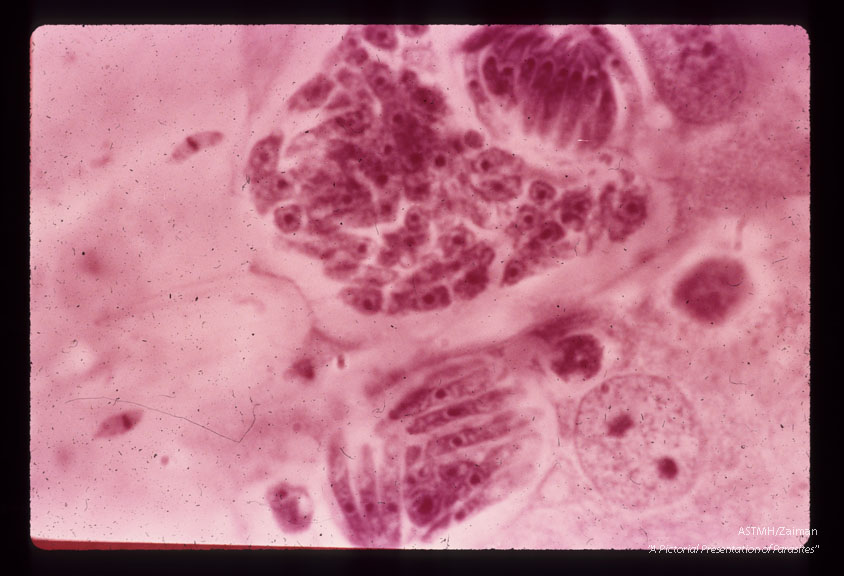 Description: Second-generation schizonts. Note that the second-generation merozoites are about twice as large as those of the first-generation. H & E stain. (96 hr).