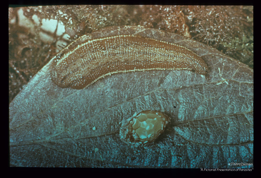 Description: Land leech and cocoon. After a single blood meal, a leech may produce several cocoons. From 10-15 or more young leeches may emerge from each cocoon. Emergence time depends upon temperature. At laboratory room temperature emergence time was around 30 days.