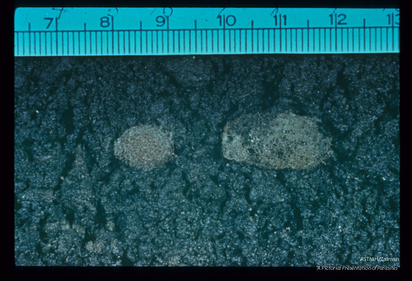 Description: Aquatic leeches such as the medicinal leeches of genus Hirudo and the large buffalo leeches of genus Hirudinaria must leave the water to deposit their cocoons in moist soil. These leeches may burrow several inches below the surface in order to do this. Shown are a cocoon of the Japanese medicinal leech, Hirudo nipponia, and a larger cocoon of the buffalo leech, Hirudinaria manillensis.