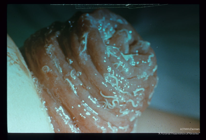 Description: High power view of prolapsed rectum showing adult worms to better advantage.