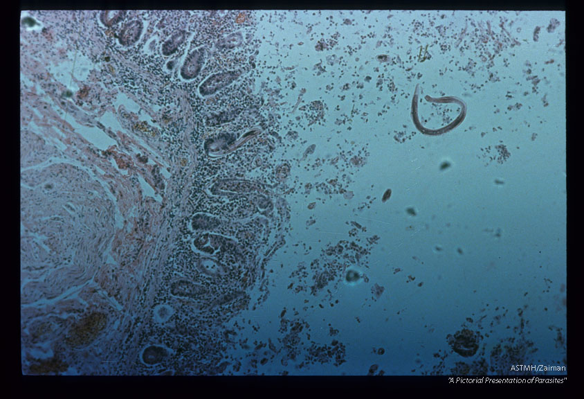 Description: Fatal case in institutionalized child. Low power view showing adult in lumen of bowel.