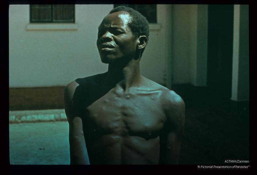 An adult african male showing numerous subcutaneous swellings which proved to the larval parasites, Cysticercus cellulosae.