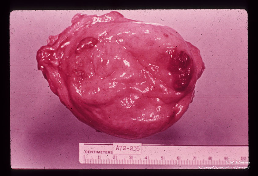 Description: Egyptian male, approximately 10 years old. Urinary bladder with red elevated lesions at the apex and along the right ureteral orifice. Live eggs were not found distant to these foci suggesting that the adult worms nest at one site for some time. Eight pairs of adults were counted in the bladder vasculature.
