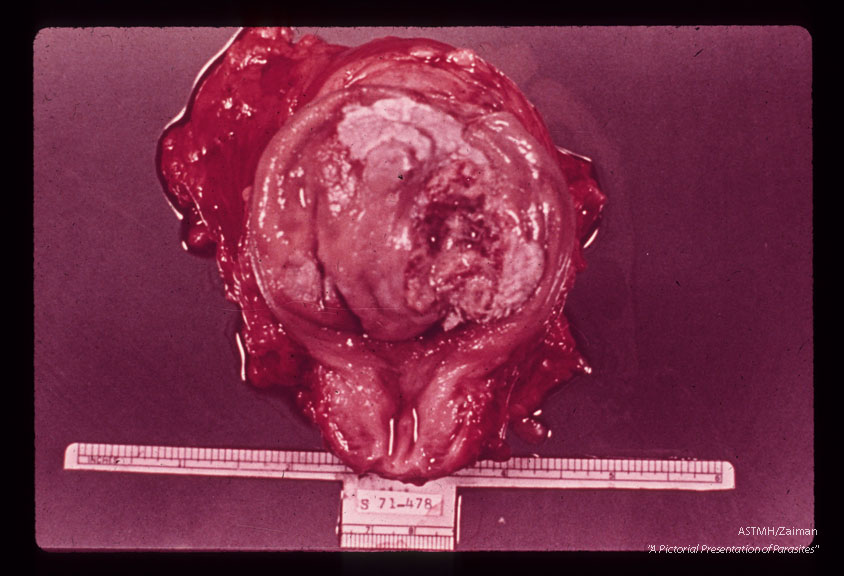 Description: Egyptian male, 26 years old. Surgically excised urinary bladder, containing 156,000 eggs per gram of host tissue-. Eighteen pairs of adults wore recovered from the specimen. The pearly white area near the apex is indicative of squamous metaplasia. The largo ulcerated mass on the right side of the bladder is a squamous cell carcinoma. The tan surface of the remainder of the bladder is a mass of confluent sandy (granulomatous) patches.
