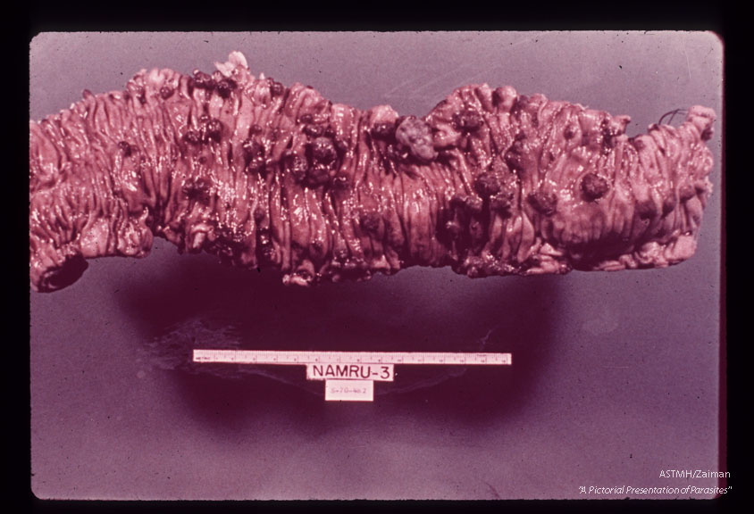 Description: Classical colonic polyposis in a surgically resected portion of colon. Patient was a 20 year old Egyptian male. Specimen fixed in formalin.